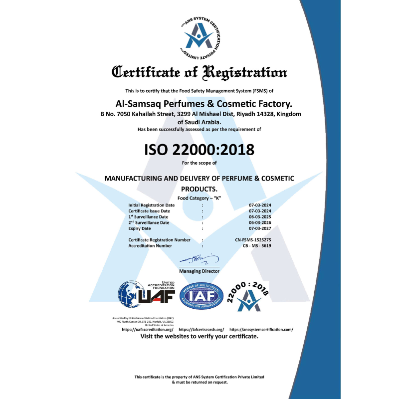 Al Samsaq adheres to the highest international standards for product safety and quality. Our facilities are certified by ISO (International Organization for Standardization) and comply with GMP (Good Manufacturing Practices). These certifications reflect our commitment to maintaining global standards and ensuring that our products are consistently of the highest quality .